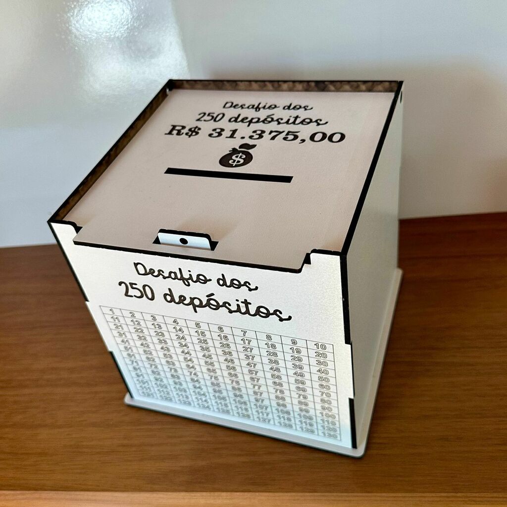 Apresentamos o Cofre Desafio 250 Depósitos, a maneira divertida e prática de alcançar seus objetivos financeiros! Este cofre em MDF é perfeito para quem deseja juntar um valor significativo de forma lúdica e envolvente.